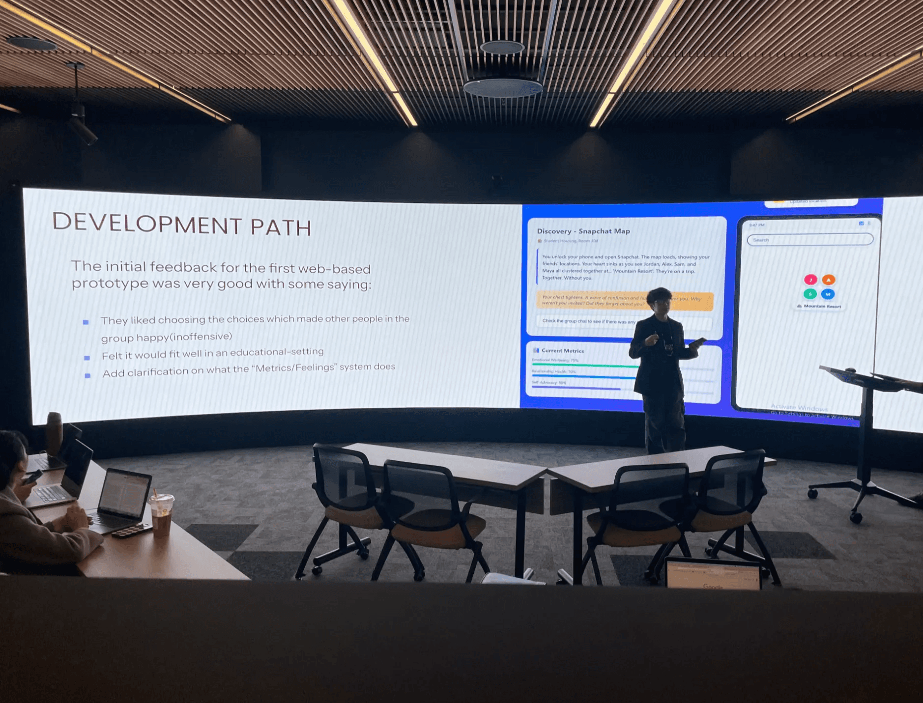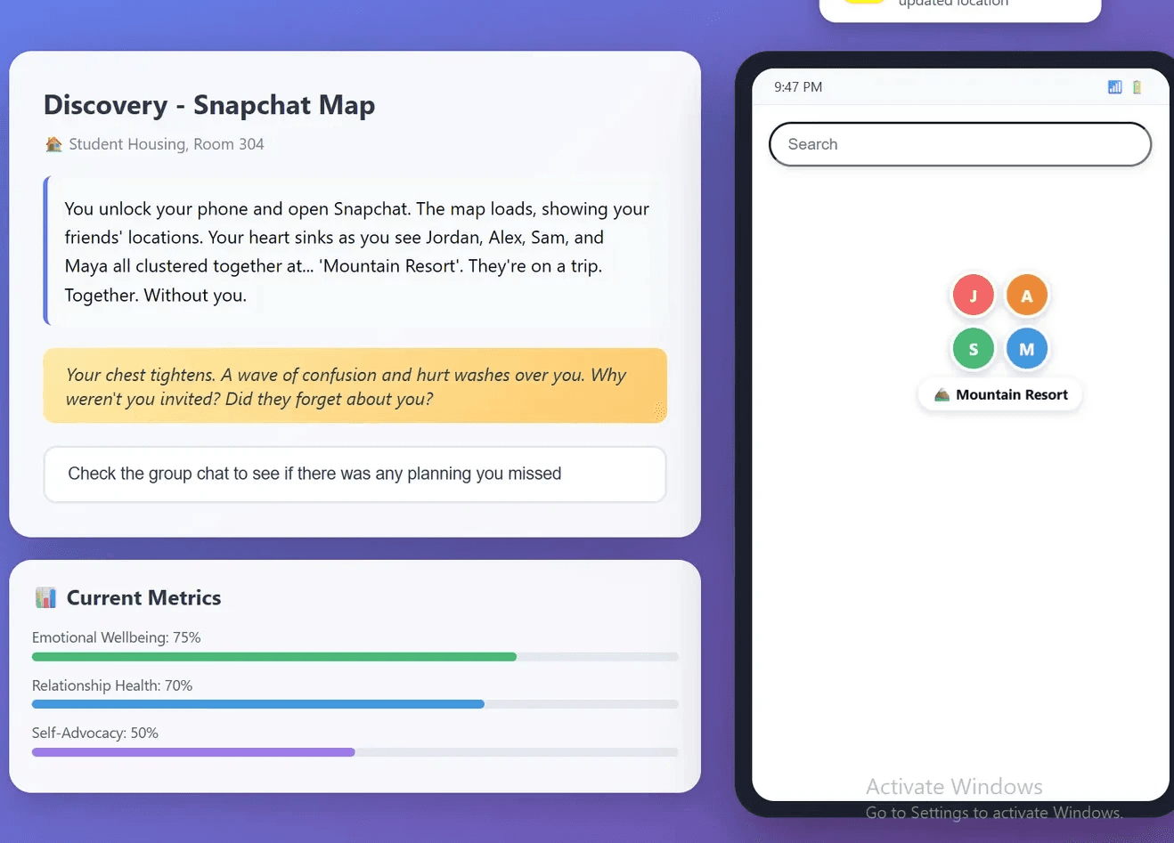 The choices you made affected the "Current Metrics" stat while the narration of how the player felt as a result of a choice displayed. The Snapchat map tablet also updates and displays notifications as if it were a real phone.